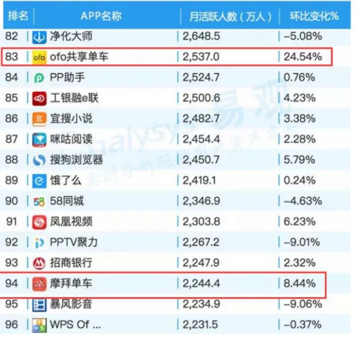 TOP1000 排行榜”,共享單車行業(yè)共有兩家企業(yè)進(jìn)入TOP100 榜單,其中,ofo以 2537 萬的活躍用戶數(shù)排名總榜單的第 83 位,摩拜單車以2244. 4 萬的活躍用戶排名總榜單的第 94 位,ofo、摩拜單車分列為共享單車行業(yè)第一、第二位置。