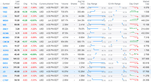 【TechWeb報(bào)道】6月28日消息,美國(guó)股市周二全面下挫,中概股多數(shù)下跌。其中,網(wǎng)易下跌2.85%,微博跌3.53%。