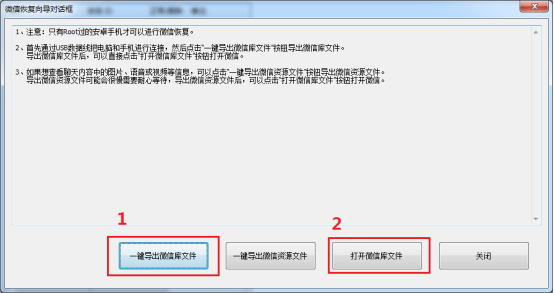 在“微信恢復向導”對話框中,首先通過USB數(shù)據(jù)線把電腦和手機進行連接,然后如下圖點擊“一鍵導出微信庫文件”按鈕導出微信庫文件。然后點擊“打開微信庫文件”按鈕,就可以打開需要恢復微信的聊天記錄的瀏覽頁面。