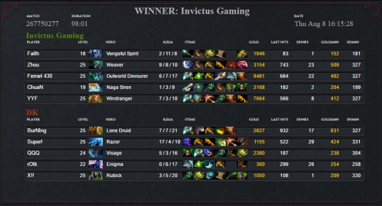 2013年TI3淘汰賽勝者組第一輪BO3第二場(chǎng) iG vs DK的角逐,雙方一直戰(zhàn)至98分01秒才由iG拿下勝利,本場(chǎng)角逐如此膀胱以至于圣劍掉在地上一分鐘都沒有人撿,DK的德魯伊刷到了12格神裝,電魂甚至換了一個(gè)BKB,肉山都已經(jīng)刷到了第九代。將近100分鐘的角逐時(shí)長(zhǎng)也創(chuàng)造了TI正賽的歷史記錄,至今無(wú)人超越。