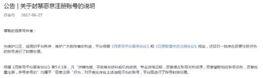 據(jù)網(wǎng)友爆料, 2017 年 6 月 27 日凌晨四點(diǎn)擺布,百度官方封禁了一大批百家號(hào)賬號(hào),數(shù)量有數(shù)十萬(wàn)之多,開(kāi)啟了有史以來(lái)最大規(guī)模的封號(hào)行動(dòng)。而截至 2017 年 3 月的數(shù)據(jù)體現(xiàn),百度官方發(fā)布的百家號(hào)賬號(hào)數(shù)量,也僅有 40 余萬(wàn)。據(jù)業(yè)內(nèi)媒體統(tǒng)計(jì),有一些專業(yè)做號(hào)機(jī)構(gòu)的千余個(gè)賬號(hào)被封,一些以原創(chuàng)內(nèi)容為主的百家號(hào)也受到了牽連。