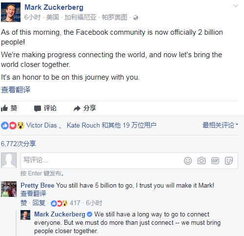 扎克伯格頒布頒發(fā)了這一里程碑?dāng)?shù)字,并體現(xiàn),要“讓世界更加緊密相連”(let's bring the world closer together)。