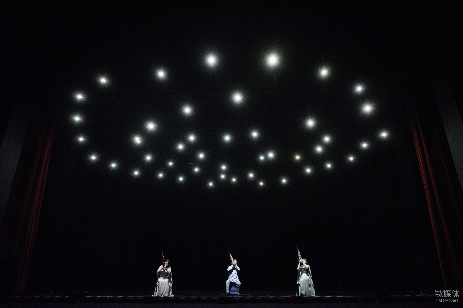 在這出作品中,唯一一個沒有可以制造形式?jīng)_突的表演是笙樂吹奏和80架無人機共同組成的表演,在這個由吳彤、鄭楊、陳人杰三位古樂表演者和無人機團隊完成的演出中。我們注意到,無人機所代表的現(xiàn)代技術和笙樂代表的傳統(tǒng)文化之間并沒有呈現(xiàn)出其他節(jié)目刻意透露出的沖突感,兩者之間更像是天然互補與融合的渾然整體。