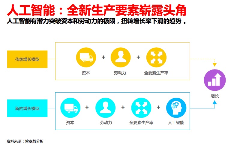 僅靠增加本錢和勞動力, 似乎已經(jīng)無法復(fù)制過往中國的高速經(jīng)濟(jì)增長 。當(dāng)人工智能作為一項(xiàng)全新的生產(chǎn)要素,而不只是生產(chǎn)率增強(qiáng)工具,將有潛力為中國經(jīng)濟(jì)帶來巨大的增長機(jī)遇。