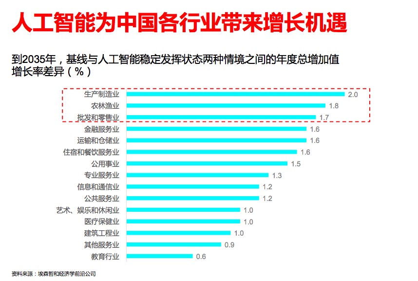 人工智能對中國各行業(yè)的影響,來源:埃森哲研究《人工智能:助力中國經(jīng)濟(jì)增長》