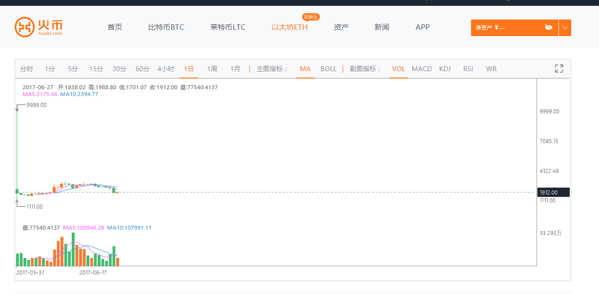 按照中國(guó)安適可信賴的以太坊交易平臺(tái)火幣網(wǎng)行情顯示,截至北京時(shí)間 6 月 27 日 10 點(diǎn),以太坊價(jià)格為 1912 元人民幣?;饚啪W(wǎng)以太坊今日開(kāi)盤(pán)價(jià)格為1838. 02 元,目前最高價(jià)格為1988. 8 元,最低價(jià)格為1701. 07 元,漲幅4.02%。
