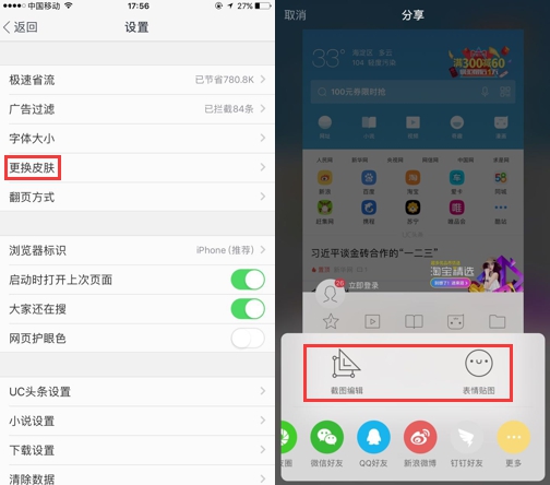 在功能設(shè)置方面,UC手機瀏覽器還具有更換皮膚和截圖編纂、心情貼圖等更加滿足用戶個性化的功能,而這一功能設(shè)置目前在其它手機瀏覽器中還并未發(fā)現(xiàn)。