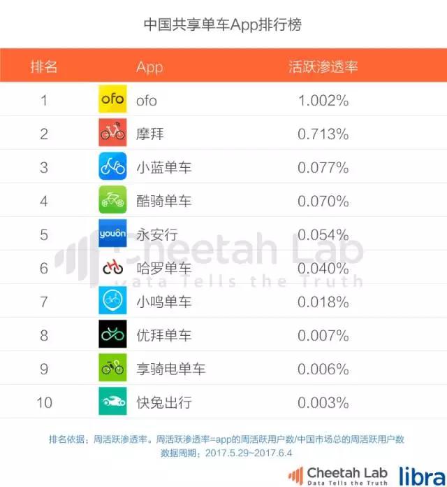 按照中國最具全球視野的移動數(shù)據(jù)研究機構Cheetah Lab(獵豹全球智庫)最新發(fā)布的“中國共享單車App排行榜”,ofo活躍滲透率為1.002%,居共享單車行業(yè)榜首,摩拜單車活躍滲透率為0.713%,排名第二。ofo活躍滲透率占優(yōu),是摩拜的超1.4倍。