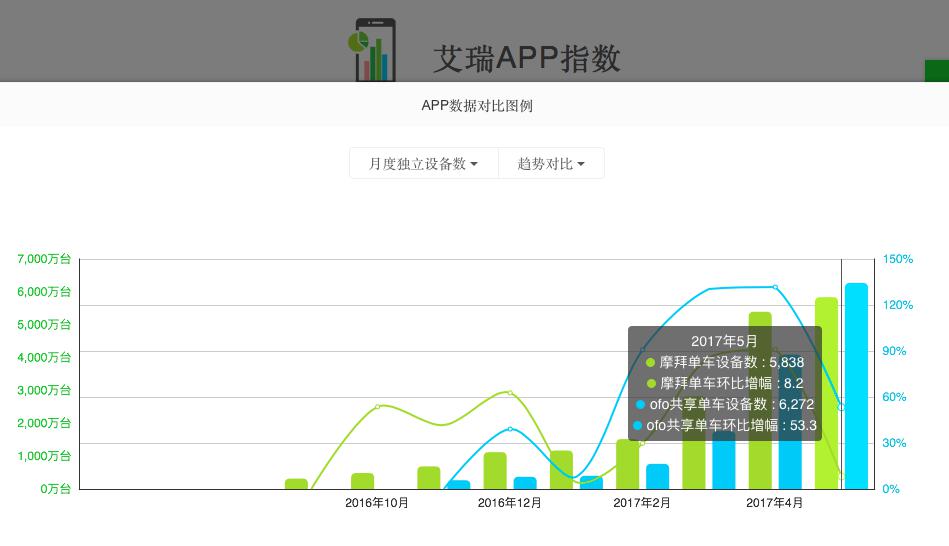 艾瑞最新5月數(shù)據(jù)顯示,ofo月度活躍用戶增長至6272萬,比擬4月,活躍用戶增長率為53.3%。摩拜月度活躍用戶增長至5838萬,比擬4月,活躍用戶增長率為8.2%。ofo活躍用戶數(shù)遠超摩拜達434萬,活躍用戶增速為摩拜的6.5倍。