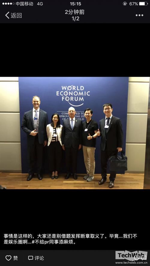 胡瑋煒隨后曬出與戴威的另一張合影,本來(lái)他們是因?yàn)橐黄饏⒓邮澜缃?jīng)濟(jì)論壇才有了合影機(jī)會(huì)。