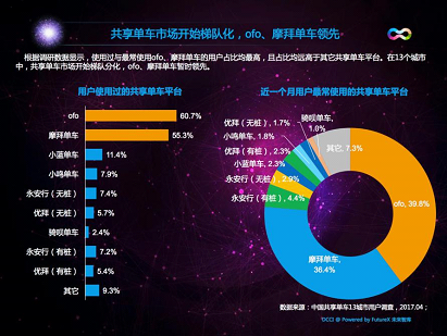 按照另一第三方權(quán)威數(shù)據(jù)機(jī)構(gòu)DCCI的《中國共享單車 13 城市用戶研究陳訴》,ofo以39.8%的絕對優(yōu)勢成為用戶使用頻次最高的共享單車,穩(wěn)居行業(yè)第一。