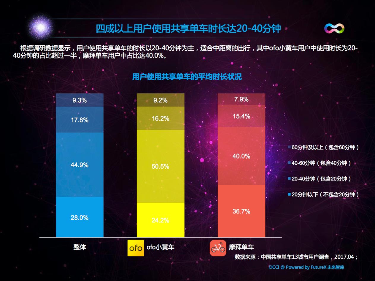 DCCI數(shù)據(jù)還顯示,用戶使用共享單車以中距離出行時長為主約20- 40 分鐘,ofo用戶中使用時長為20- 40 分鐘的占比超過一半為50.5%,摩拜單車使用時長為20- 40 分鐘的用戶占比為40.0%,ofo用戶粘性遠超摩拜。