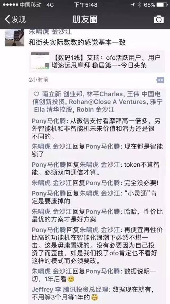 6月19日,朱嘯虎與馬化騰在伴侶圈“公開互懟”,爭論各自的投資項(xiàng)目摩拜單車和ofo小黃車數(shù)據(jù)領(lǐng)先問題。這對于一向心直口快的朱嘯虎來說倒不是新鮮事,但對于低調(diào)內(nèi)斂的馬化騰來說卻是極為少見的事。
