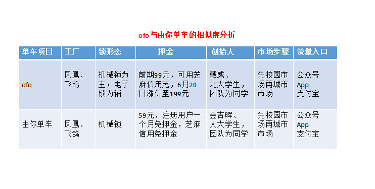 阿星在本年四月騎行由你單車時,就發(fā)現(xiàn)由你與小黃車的高度相似性,二者均是通過微信公眾號輸入單車的車牌號開啟或掃碼開啟,配置的是機械鎖。據(jù)了解,由你單車創(chuàng)始人金吉暉是人大學生, ofo創(chuàng)始人戴威也是北大學生;由你單車第一批投放是在人大校園,而ofo起源于北大校園。二者之間差距主要是在車輛顏色和押金額度上。