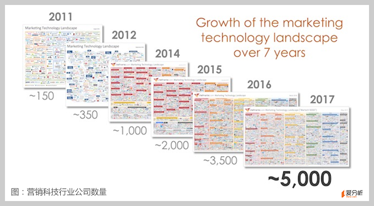 從供給端角度來(lái)看,大量的營(yíng)銷科技類公司開始出現(xiàn),根據(jù)ChiefMartec.com創(chuàng)始人Scott Brinker統(tǒng)計(jì),截止目前,已經(jīng)出現(xiàn)近5000家營(yíng)銷科技類企業(yè),其中絕大部分都是近兩年冒出來(lái)的公司。