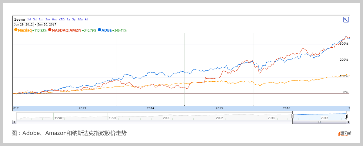 一般來(lái)說(shuō),業(yè)務(wù)成熟的公司市值都相對(duì)不變,而Adobe作為一家老牌科技公司,股價(jià)在2012年至今這5年間,狂飆了300%,市值從160億上漲到近700億美元,上演了一出和Amazon一樣的傳奇。