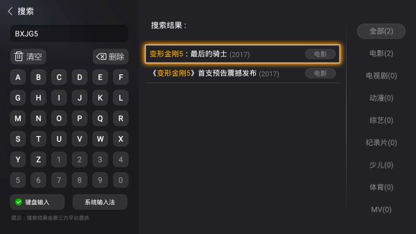 安置完成,在搜索框搜索《變形金剛5:最后的騎士》的首字母“BXJG5”即可在線不雅觀看。