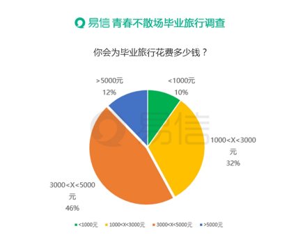 關(guān)于旅行花費(fèi),據(jù)易信不完全網(wǎng)絡(luò)調(diào)查顯示,45.7%的大學(xué)結(jié)業(yè)生旅行預(yù)算在3000到5000之間,預(yù)算在1000-3000元的人數(shù)占比也較大,達(dá)到32.3%,預(yù)算在5000元以上的占比為12.2%,另有9.8%的結(jié)業(yè)生更傾向“窮游”,旅游經(jīng)費(fèi)預(yù)算控制在1000元以下。