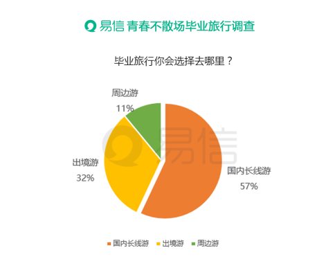 結(jié)業(yè)進(jìn)行時,青春不散場,不少大學(xué)結(jié)業(yè)生決定牽手戀人、帶著閨蜜來一場終生難忘的結(jié)業(yè)旅行。據(jù)易信網(wǎng)絡(luò)調(diào)查數(shù)據(jù)顯示,國內(nèi)跨省長線游最受結(jié)業(yè)生青睞,占比高達(dá)57%,此外,32%的網(wǎng)友選擇了出境游,,11%的易信網(wǎng)友選擇周邊短途作為結(jié)業(yè)旅行。