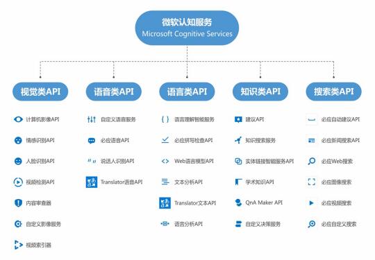微軟認(rèn)知辦事涵蓋視覺類、語音類、語言類、知識類、搜索類等 29 個API