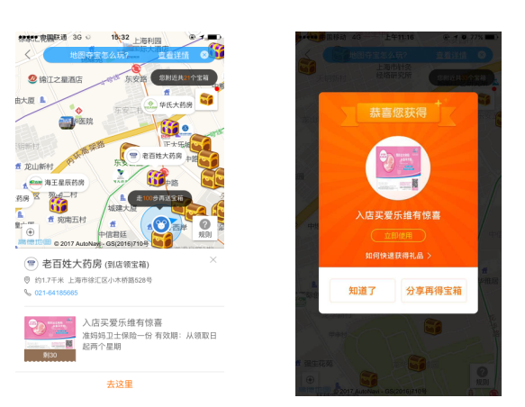 活動(dòng)通過(guò)安然全醫(yī)生APP內(nèi)的步步奪寶模塊,讓用戶在真實(shí)的地圖場(chǎng)景中尋找到附近線下門(mén)店的合作藥房寶箱,獲得寶箱優(yōu)惠券,同時(shí)按照GPS定位在離用戶比來(lái)的合作門(mén)店購(gòu)買(mǎi)愛(ài)樂(lè)維復(fù)合維生素片即可獲得驚喜大禮包,讓用戶在行走的不經(jīng)意間參與了整個(gè)營(yíng)銷(xiāo)活動(dòng),擴(kuò)大了品牌的聲量,在體驗(yàn)奪寶的樂(lè)趣中為備孕的人群提供了精準(zhǔn)營(yíng)銷(xiāo)。