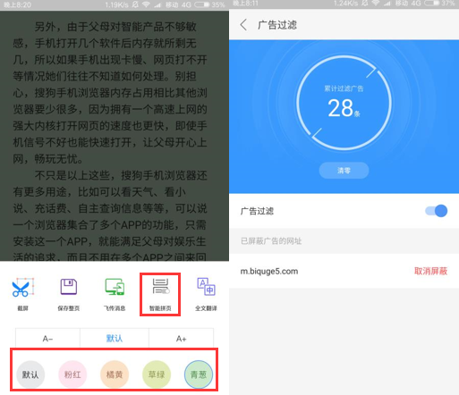 在瀏覽體驗上,網(wǎng)頁護眼色功能和廣告過濾,相對來說是一些瀏覽器都具備的功能,護眼色就是為小編這樣的重度手機依賴患者準(zhǔn)備的。廣告過濾自然是讓那些“彈彈彈”的垃圾廣告在眼前徹底消失。護眼色功能在底端的菜單欄里可以看到,廣告過濾功能則在設(shè)置里。