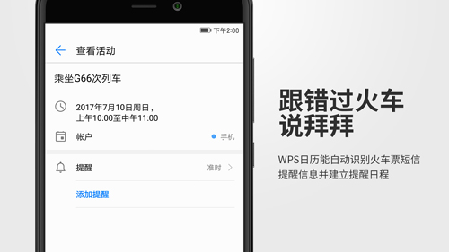 害怕大腦短路,忘記火車出發(fā)時間?別擔心,有了WPS日歷,您再也無需擔心會錯過火車搭乘時間了。WPS日歷能自動識別火車票短信提醒信息并建立提醒日程,您還可按照出發(fā)時間建立多個提醒時間,例如好比提前 2 小時提醒,從此再也不消擔心錯過火車了。