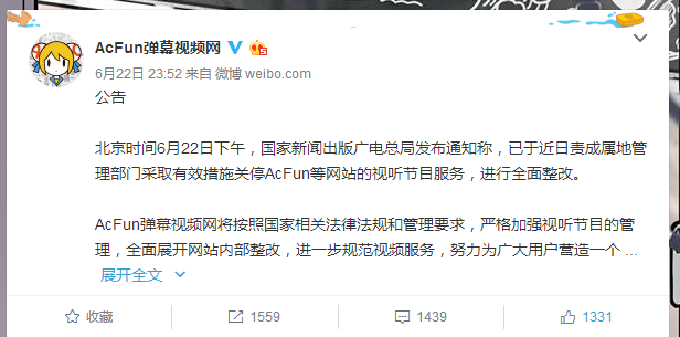 站長之家(Chinaz.com) 6 月 22 日消息 日前,國家新聞出版廣電總局要求“新浪微博”、“ACFUN”、“鳳凰網(wǎng)”等網(wǎng)站關停視聽節(jié)目辦事,消息一出后,A站和微博等網(wǎng)站紛紛作出了回應。