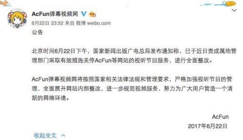 【TechWeb報道】 6 月 23 日消息,國家新聞出版廣電總局昨日發(fā)布公告,要求新浪微博、A站、鳳凰網(wǎng)等關(guān)停視聽節(jié)目辦事,進(jìn)行全面整改。對此,A站在官方微博回應(yīng)稱,全面展開網(wǎng)站內(nèi)部整改。