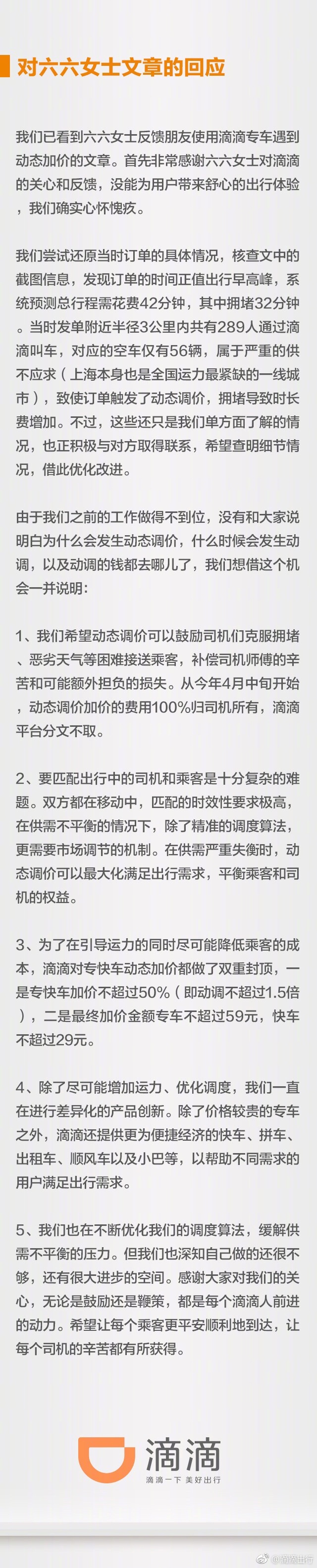 對此,滴滴出行官方發(fā)布了一篇長文《對六六女士文章的回應(yīng)》,針對當(dāng)時的訂單進(jìn)行了核查,體現(xiàn)當(dāng)時的情況屬于嚴(yán)重的供不該求,致使訂單觸發(fā)了動態(tài)調(diào)價,擁堵導(dǎo)致時長費增加。同時也正積極與對方取得聯(lián)系,希望查明細(xì)節(jié)情況,借此優(yōu)化改進(jìn)。
