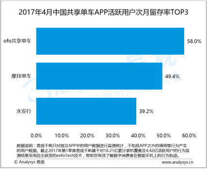 實際上,ofo小黃車一直以用戶體驗至上,為用戶提供最好的辦事,這也使ofo用戶粘性很高。按照第三方權威數(shù)據(jù)機構易不雅觀陳訴顯示,本年4月,ofo小黃車APP活躍用戶次月留存率達到58.0%,領先于摩拜單車和永安行,排名行業(yè)第一。