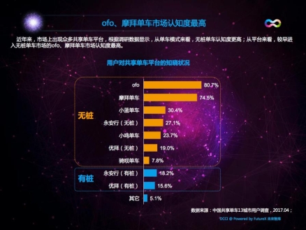 國內(nèi)第三方權威數(shù)據(jù)機構DCCI發(fā)布了《中國共享單車13城市用戶研究陳訴》,對比了ofo、摩拜、小藍單車、永安行、小鳴單車、優(yōu)拜和騎唄等眾多共享單車品牌的數(shù)據(jù),得出了詳實的行業(yè)研究結果。按照,DCCI的研究,ofo小黃車市場認知度為80.7%,位居行業(yè)首位。