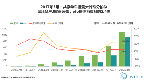 來自國內(nèi)移動互聯(lián)網(wǎng)數(shù)據(jù)監(jiān)測機構Trust Data發(fā)布的《2017年Q1中國共享單車行業(yè)用戶監(jiān)測陳訴》中的數(shù)據(jù)也證明了ofo小黃車的發(fā)展速度驚人。TrustData陳訴顯示,在2017年1季度,ofo的月活躍用戶數(shù)呈現(xiàn)出了快速增長的趨勢,在3月ofo的環(huán)比增速達到了近170%,為行業(yè)最高水平,同為行業(yè)第一梯隊的摩拜僅為71.6%,而整個共享單車行業(yè)的平均增速為105%。考慮到ofo在整個行業(yè)內(nèi)的體量和權重,可以說在整個1季度的共享單車增長中,始終連結高增速的ofo是當之無愧的發(fā)動機。