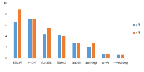 各重點監(jiān)測平臺借款期限變動總體較小,但銅掌柜與多多理財出現(xiàn)了較大幅度的上升,銅掌柜平均借款期限較 4 月增長35%,多多理財平均借款期限較 4 月增長26%。別的,各平臺間該項指標差異較大。 5 月,重點監(jiān)測平臺平均借款期限最長的銅掌柜為8. 85 個月,與最短的十六鋪金融的0. 66 個月相差8. 19 個月。這也說明各平臺之間在借貸人心中的分量依然有較大差距。
