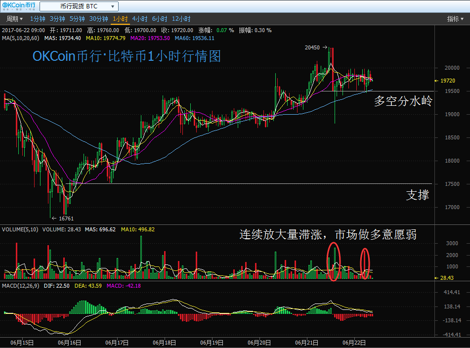 OKCoin幣行分析師稱(chēng),雖然當(dāng)下的多頭趨勢(shì)還沒(méi)有徹底改變,但是市場(chǎng)已經(jīng)明顯表示出頹勢(shì)格局,漲速比擬前期明顯減弱。針對(duì)當(dāng)前市場(chǎng)的操作思路就是只看不動(dòng),等待明朗機(jī)會(huì)出現(xiàn)。日內(nèi)重點(diǎn)關(guān)注 19450 一線(xiàn)平臺(tái)支撐,,放量的跌破則離場(chǎng)不雅觀望,下方關(guān)注 17520 附近支撐,首次觸及可采取分批介入策略建倉(cāng),輕倉(cāng)操作,嚴(yán)格止損。