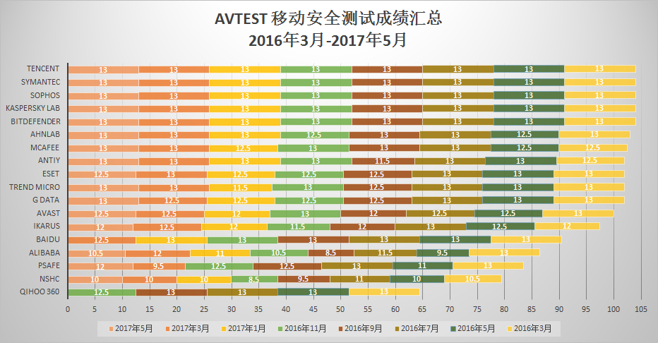 (圖:AV-Test公布 5 月測試結(jié)果,騰訊手機管家滿分通過)