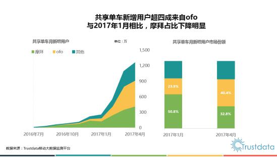 同時(shí),在共享單車行業(yè)4月新增的1200萬(wàn)用戶份額中,40.4%的新增用戶份額來自ofo,32.8%的新增用戶份額來自摩拜??偟膩碚f,ofo在用戶增速、新增用戶份額方面穩(wěn)居行業(yè)第一,成為了持續(xù)增長(zhǎng)最快的共享單車平臺(tái),率先獲得最多用戶的青睞。