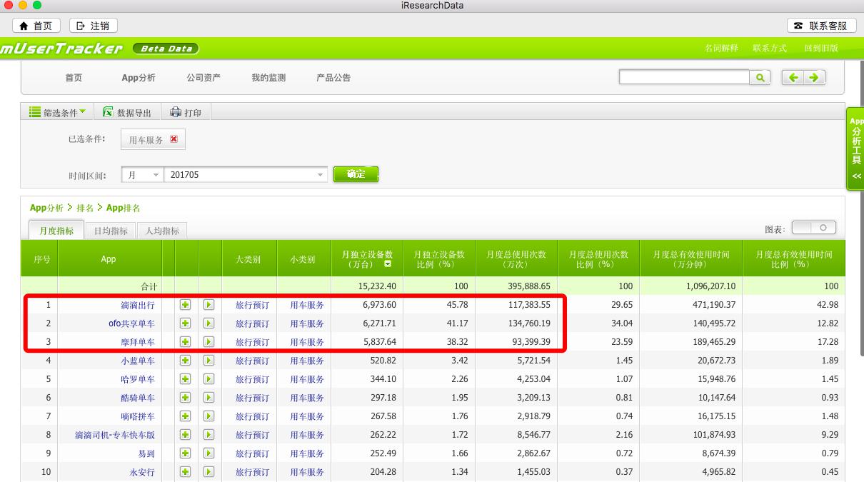 據(jù)最新艾瑞分析可以了解到,ofo活躍用戶5月的月度總使用次數(shù)為134760.19萬(wàn)次,摩拜用戶月度總使用次數(shù)為93399.39萬(wàn)次。更值得一提的是,ofo用戶月總使用次數(shù)領(lǐng)先摩拜超4億次、約合是摩拜1.4倍之外,還超越了使用次數(shù)為11. 7 億次的滴滴出行。比擬較而言,共享單車用戶使用頻率已經(jīng)超越了網(wǎng)約車,而ofo則成為了第一大共享出行平臺(tái)。