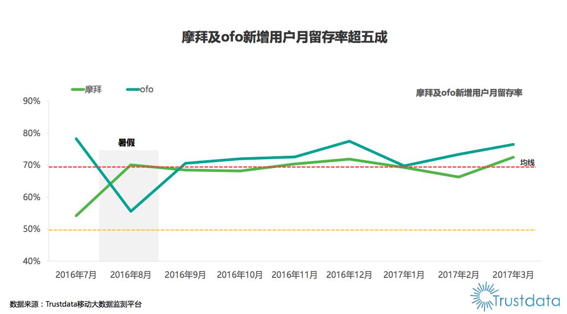 而從用戶增速也直不雅觀反映用戶對(duì)于共享單車品牌的認(rèn)可與忠實(shí)度,按照Trustdata最新4月數(shù)據(jù)顯示,ofo3 月新增用戶數(shù)在整體行業(yè)中占比超41%,是摩拜的近1. 3 倍,超第二名摩拜、第三名酷騎的新增用戶數(shù)之和。ofo新增用戶的月留存率始終高于行業(yè)70%的平均水平,且連續(xù) 8 個(gè)月超越摩拜的新增用戶月留存率,行業(yè)第一的地位已愈發(fā)安靖。