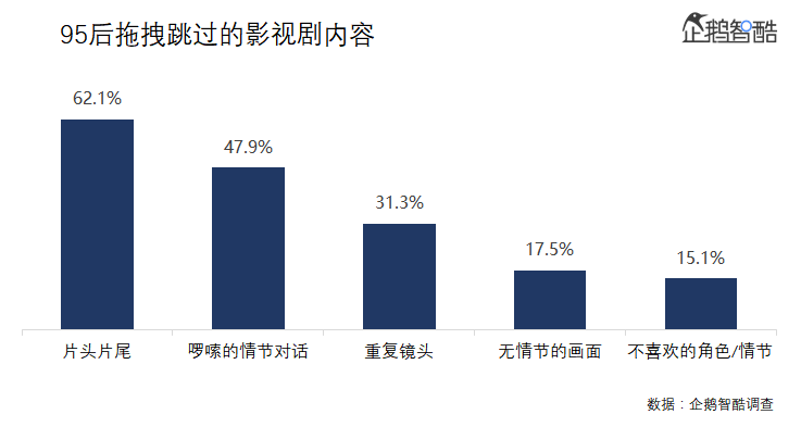 企鵝智庫還提到的一個重要特征是,95后越來越快速的消費(fèi)習(xí)慣讓他們在面對長內(nèi)容時,會出現(xiàn)頻繁的拖拽行為。95后會連年長者出現(xiàn)更頻繁的拖拽行為。除了片頭片尾之類的重復(fù)內(nèi)容,對于不喜歡的演員或情節(jié),也有超過15%的95后會快進(jìn)跳過。