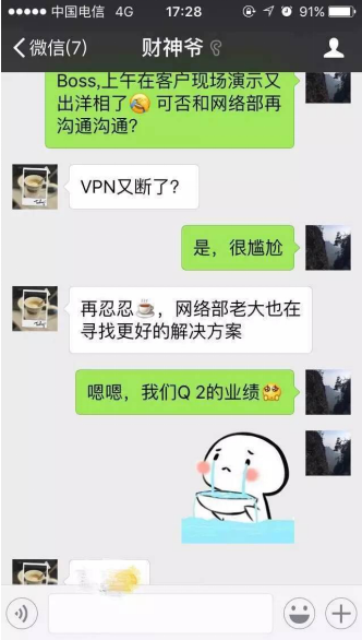 小A君是小編的表弟,也是某五百強海外分公司的業(yè)務(wù)經(jīng)理,經(jīng)常需要到客戶現(xiàn)場介紹公司產(chǎn)品。常因為公司VPN出問題無法向客戶進行現(xiàn)場演示。小A君除了尷尬郁悶以外,還很擔心這個季度的業(yè)績考核腫么辦?