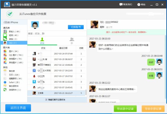 第四步:掃描結(jié)束之后,在左側(cè)的數(shù)據(jù)中找到“QQ”一欄點(diǎn)擊,旁邊出現(xiàn)有QQ賬號(hào)以及好友信息,點(diǎn)擊任意的好友右側(cè)則出現(xiàn)有詳細(xì)的聊天記錄,,以此方式確認(rèn)了需要恢復(fù)的聊天記錄之后點(diǎn)擊“導(dǎo)出選中記錄”按鈕,軟件就開始對選中的記錄恢復(fù)了。