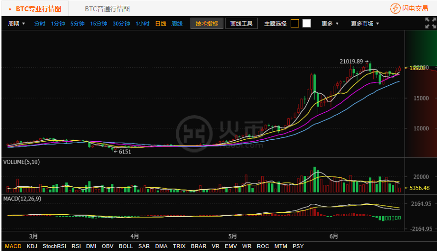 看火幣網(wǎng)比特幣行情日線圖?;饚啪W(wǎng)比特幣價格繼續(xù)沿趨勢上漲,繼昨日受到MA20 支撐后,今日再度上漲,重新站上所有均線,而且成交量溫和放大,價格再次迫近 20000 元關口??椿饚啪W(wǎng)比特幣行情小時圖。昨日早 8 時,放量突破平臺,此后一路回調(diào)至下方平臺上沿,在 19200 元附近反復支撐,最終在晚間開始拉升,從拉升力度看,做多動能有限。因此上方壓力還需進一步消化?;饚啪W(wǎng)溫馨提示:投資有風險,入市需謹慎。
