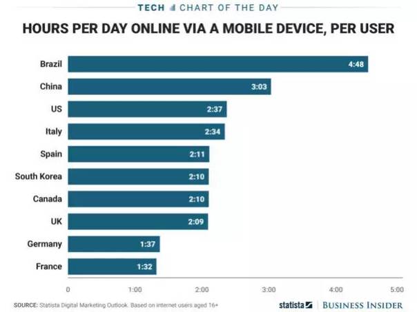 美國(guó)、意大利、西班牙、韓國(guó)、加拿大、英國(guó),每天玩手機(jī)的時(shí)間也都超過了 2 小時(shí),分列第三到八位。而法國(guó)、德國(guó)相對(duì)較短,約1. 5 小時(shí)。
