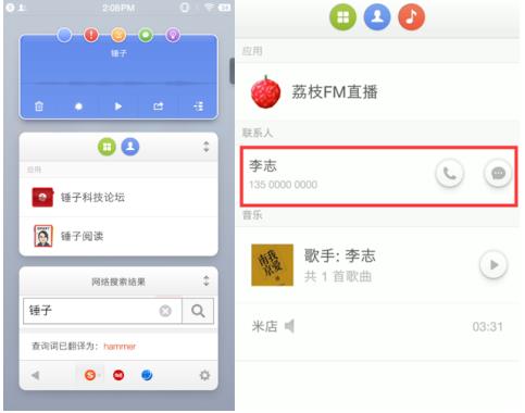 閃念膠囊還提供語(yǔ)音搜索的功能。只要在長(zhǎng)按home鍵時(shí),說(shuō)出相關(guān)應(yīng)用、音樂(lè)、聯(lián)系人的名字,就可以呼出相關(guān)的程序,十分便當(dāng)。比起在繁瑣的手機(jī)應(yīng)用圖標(biāo)中找尋應(yīng)用,效率提高很多。