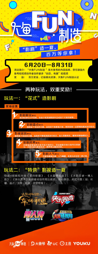 這四大IP共尋“導(dǎo)演”,就是一次由官方發(fā)布的二次創(chuàng)作征集活動(dòng)——阿里旗下的自媒體平臺(tái)大魚(yú)號(hào),特設(shè)價(jià)值百萬(wàn)的獎(jiǎng)項(xiàng),面向大魚(yú)號(hào)創(chuàng)作者懸賞征集優(yōu)質(zhì)影劇品類短視頻,活動(dòng)名為“大魚(yú)FUN制造”,旨在激發(fā)短視頻自媒體的創(chuàng)意和活力,為用戶提供更多、更好的熱門(mén)IP周邊原創(chuàng)內(nèi)容。