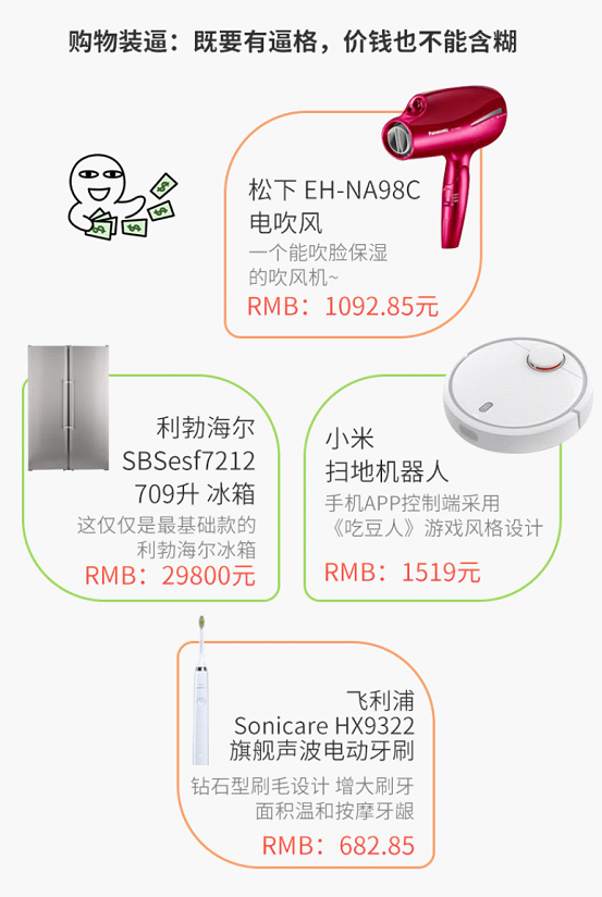 第二,品質(zhì)升級成為主流趨勢。為適應(yīng)消費(fèi)升級的大趨勢,本年 618 各平臺都不約而同地主打品質(zhì)升級,主流電商更是在這一概念上做足了文章。天貓電器、國際、生鮮、醫(yī)藥等多場館發(fā)起主題品類促銷,還有家庭影院直降 9000 的宣傳;京東在美食、旅游、醫(yī)療、教育等品類上大做文章,促進(jìn)產(chǎn)品消費(fèi)向辦事消費(fèi)轉(zhuǎn)化。