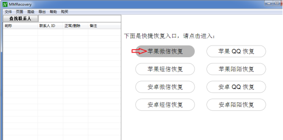 接下來就不需要手機了可以拔掉了,首先運行恢復(fù)工具MMRecovery,如下圖在右側(cè)快捷恢復(fù)入口,點擊 “蘋果微信恢復(fù) ”按鈕,將會彈出“微信恢復(fù)向?qū)А睂υ捒颉?/p>