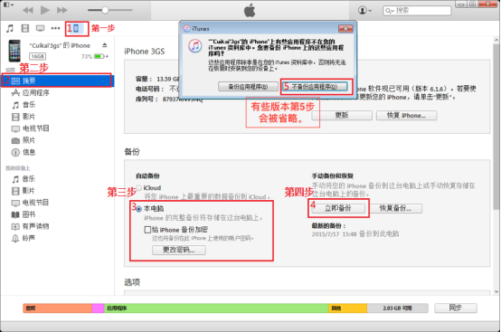 那么如何將生存微信聊天記錄的文件全部導(dǎo)出到電腦上呢?這里我們需要使用蘋果公司的iTunes辦理工具備份蘋果手機中的數(shù)據(jù)(可從蘋果網(wǎng)站免費下載或百度“iTunes下載”獲取)。下圖是使用iTunes備份蘋果手機數(shù)據(jù)的步驟。