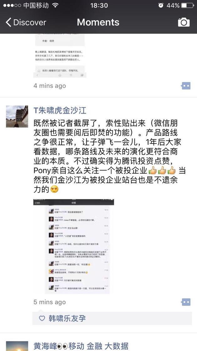 “數(shù)據(jù)說(shuō)明一切, 1 年后看”,朱嘯虎為馬化騰關(guān)注摩拜的舉動(dòng)點(diǎn)贊,但又調(diào)侃了句微信:應(yīng)設(shè)閱后即焚功能。(韓大鵬)